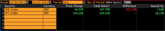 If we contrast this with something like the FTSE 350, which in sterling terms has underperformed the S&P 500 significantly over the last 10 years: