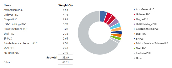 We can see that whilst it is similarly concentrated in the top 10 (accepting that there is a lower total number of constituents) there is more sectoral diversity in the top ten stocks, and there are more businesses that could be said to be explicit beneficiaries of inflationary impulses: