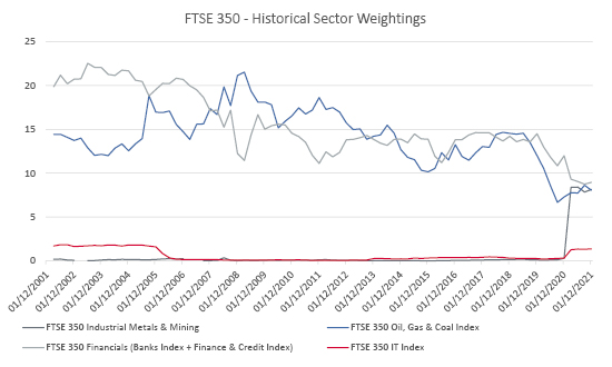 Source: FTSE 350 Index Historical Sector Weightings - Bloomberg LP, AJ Bell – January 2022