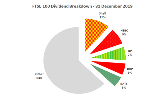 The UK in recent years has paid a higher dividend compared to global equities in general. For example, at the end of 2019 the expected dividend yield for the FTSE 100 was 4.5% –almost twice that of the MSCI World index at 2.3%. This is driven by the makeup of the UK market, dominated by Banks, Energy, Materials and Consumer Staples, which are traditionally seen as mature, dividend-paying businesses. This is in contrast to global benchmarks, where Technology tends to dominate. The combination of the largest companies also being some of the largest dividend payers created a concentration risk to UK dividends – for example, Shell represented 11% of the total yield. The following graphic provides a breakdown of the FTSE 100 yield at the end of last year: