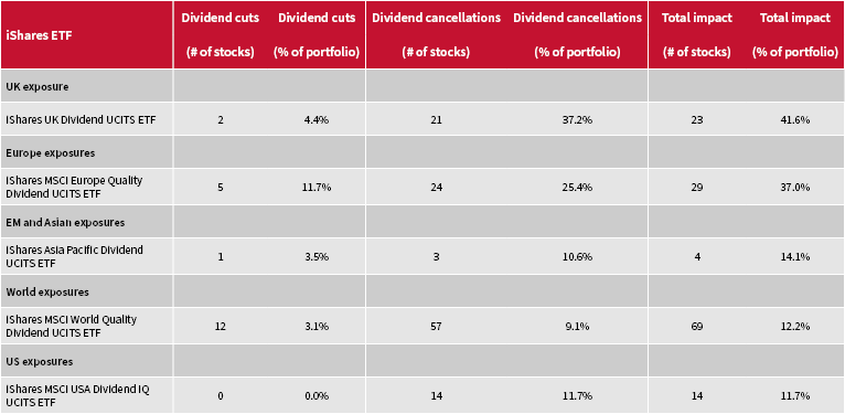 It can be seen that the cuts are greatest in the UK and, although closely followed by the European product, this is because this index also includes a 30% weighting to the UK. Other regions have seen between 10% and 20% of companies cutting or cancelling dividends.