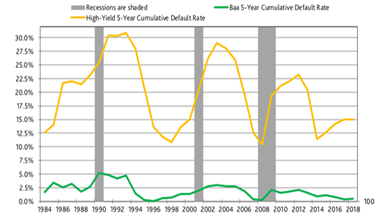 The following data from Moody’s shows the five-year default rate of both investment-grade (green) and high-yield (gold) bonds. This peaked at around 30% in the 1990 and 2001 recessions, compared to a lower peak of 22.5% in 2008. This is perhaps due to the action of central banks to lower interest rates and provide liquidity support. Given the coordinated central bank support this time around, and coupled with the equity buffer, we believe the situation will be more akin to the 2008 situation. This means that even default-adjusted, high-yield bonds offer a competitive income if history repeats.