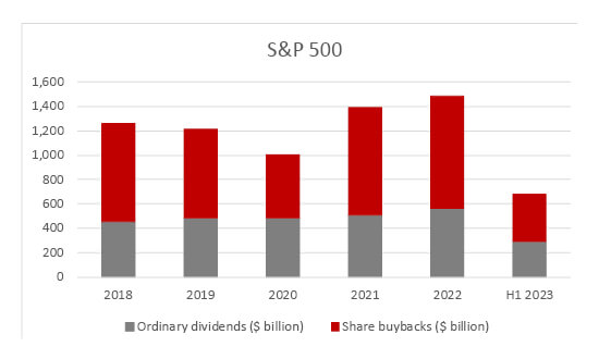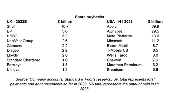 Source: Company accounts, Standard & Poor’s research. UK total represents total payments and announcements so far in 2023. US total represents the amount paid in H1 2023.