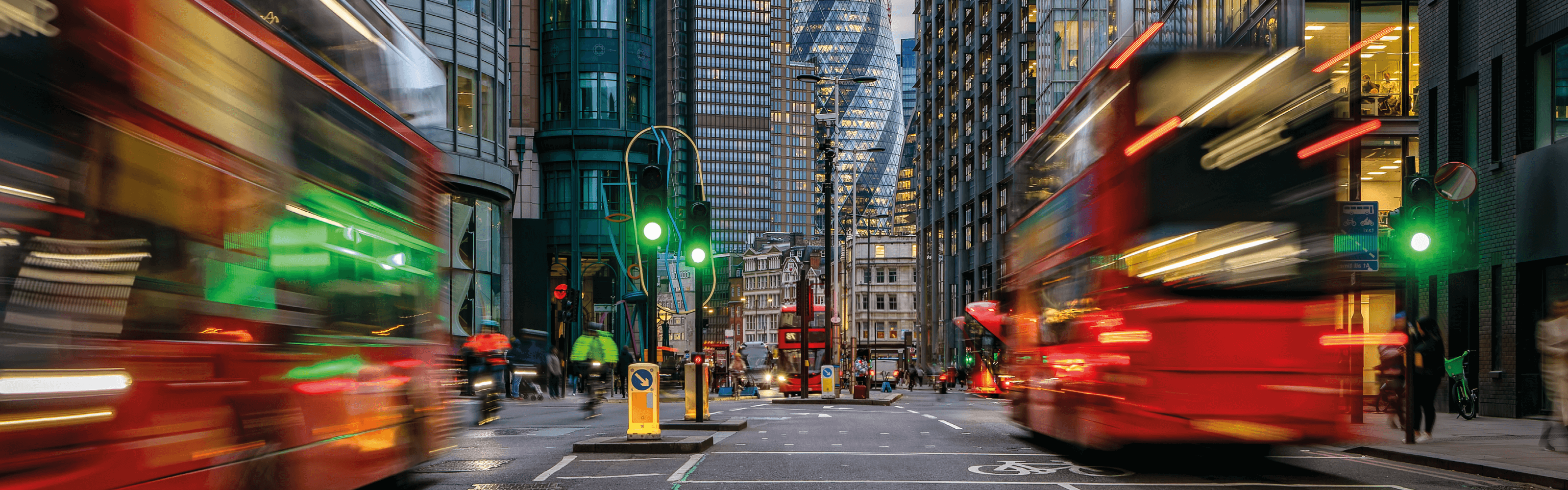 Image of road in central London with red buses and gherkin building in background