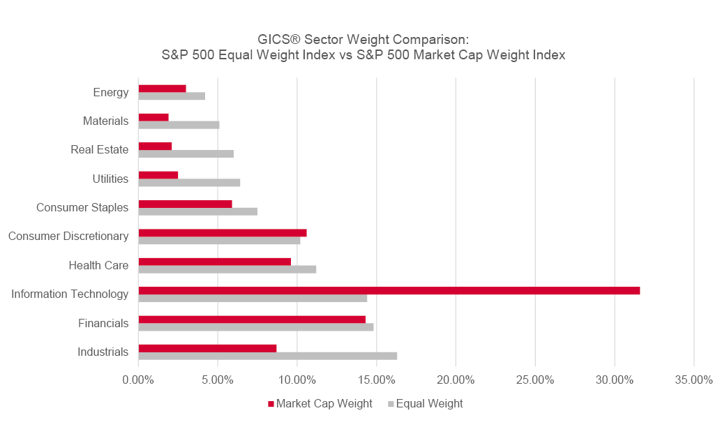 You can see this by comparing the GICS sector breakdown of the two indices below. Whereas information technology dominates the traditional market cap-weighted index, at the expense of the likes of energy, materials, real estate and utilities, the equal weight index has a more balanced sector profile overall.