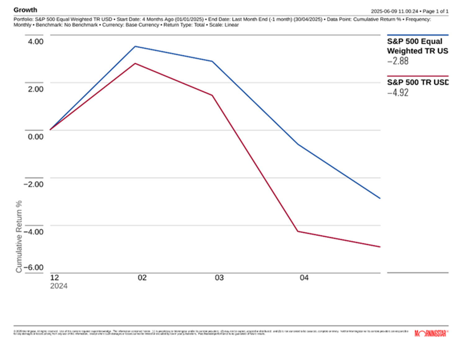 Source: 2025 Morningstar – S&P 500 Equal Weight Index vs S&P 500 Market Cap Weight Index – 01/01/2025 to 30/04/2025