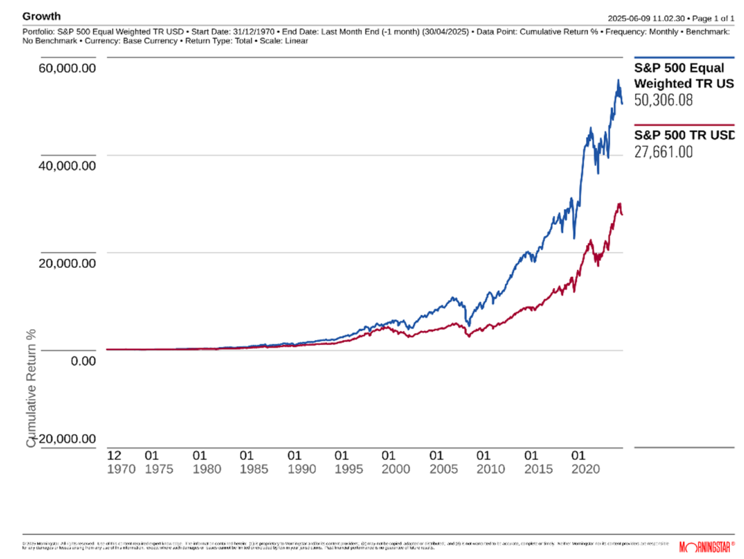 Source: 2025 Morningstar – S&P 500 Equal Weight Index vs S&P 500 Market Cap Weight Index – 31/12/1970 to 31/05/2025