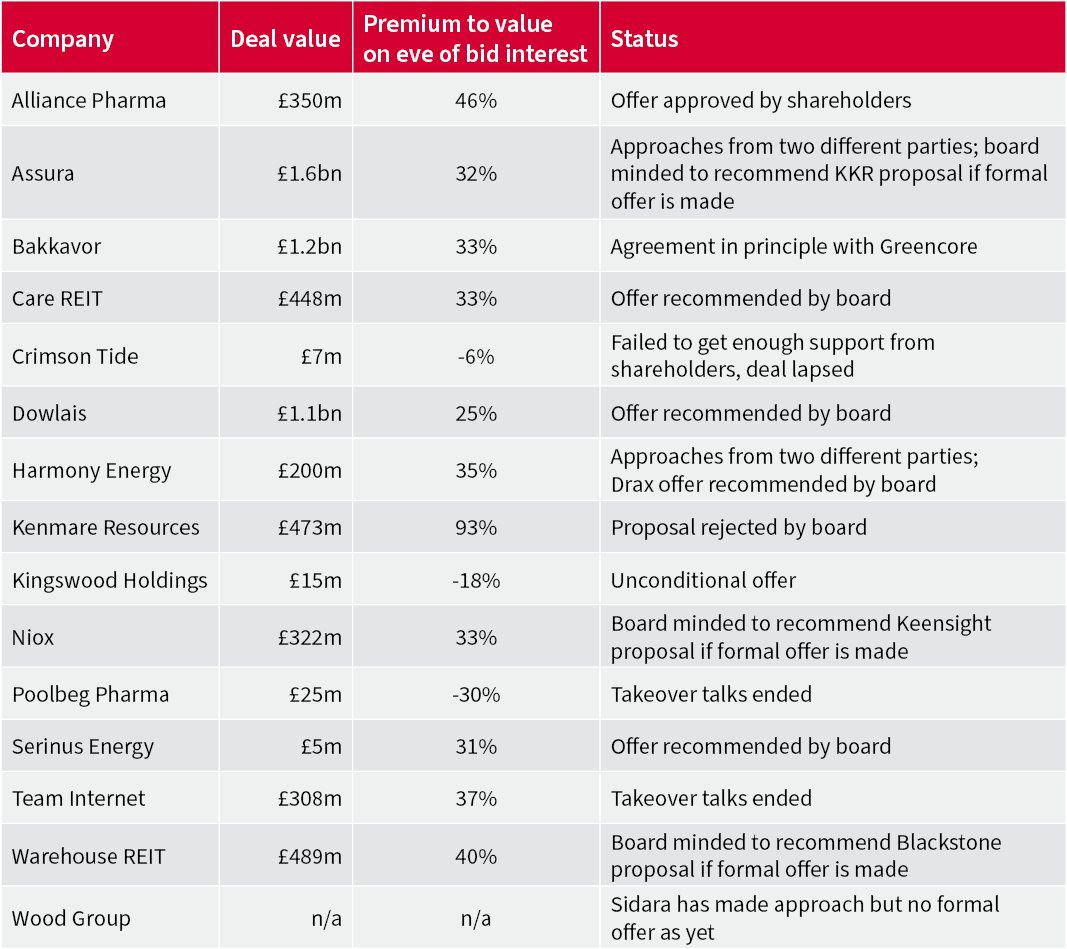 Takeovers can take time to play out, even after a board agrees an offer. Shareholders have to vote and competition authorities often get involved if they are worried about the enlarged entity having too dominant a market position. Certain takeover approaches in Q1 have already collapsed and in three situations we’ve got a suitor showing interest but not yet making a formal offer.