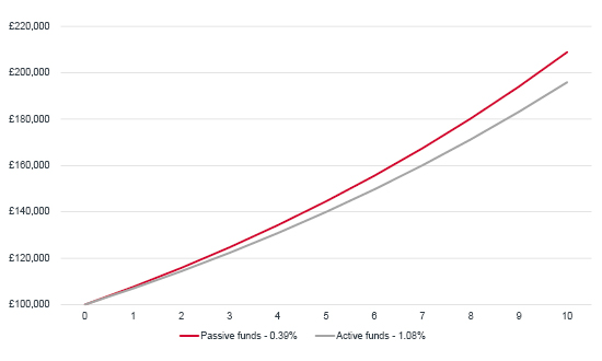 We can see from our own analysis the effect of fees on a 10-year investment time horizon. The SPIVA comparisons are slightly unfair, as an index does not have a management charge (unlike real-life passive funds). They also assume perfect rebalancing and frictionless transaction costs. Perhaps a better comparison would be to compare two indexes net of passive and active fees. Here we look at the average OCFs of a range of passive and active multi-asset funds, which come out to 0.39% and 1.08% respectively. For a portfolio starting at £100,000, investing in line with a 60:40 equity:bond split would have yielded an annual return of around 8.04% gross of fees over the last 10 years. Net of fees, this would have resulted in a total value of £209k for the passive portfolio and £196k for the active portfolio at the end of the period – around £13k difference.