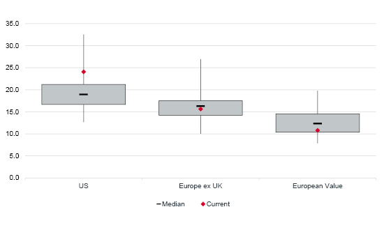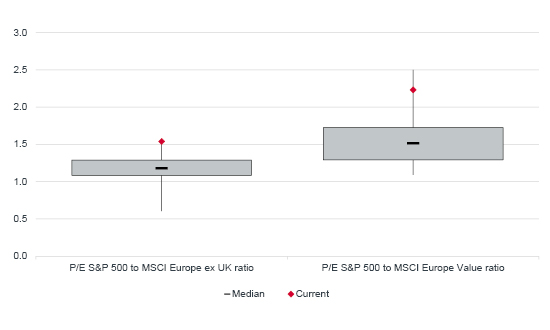 An interesting area for active investors could be those unloved, less liquid areas of the market, such as European value stocks. These are currently running at historically low valuations, despite naturally paying a high dividend yield as well as high buyback yields, taking the total running yield of the index to around 8%. What is more interesting is that the ratio of valuations for MSCI Europe ex UK as well as MSCI Europe Value against the S&P 500 is also at a historic high, at around 1.5 times and 2.2 respectively. In fact, the ratio between the US and broader market Europe ex UK index has never been higher.