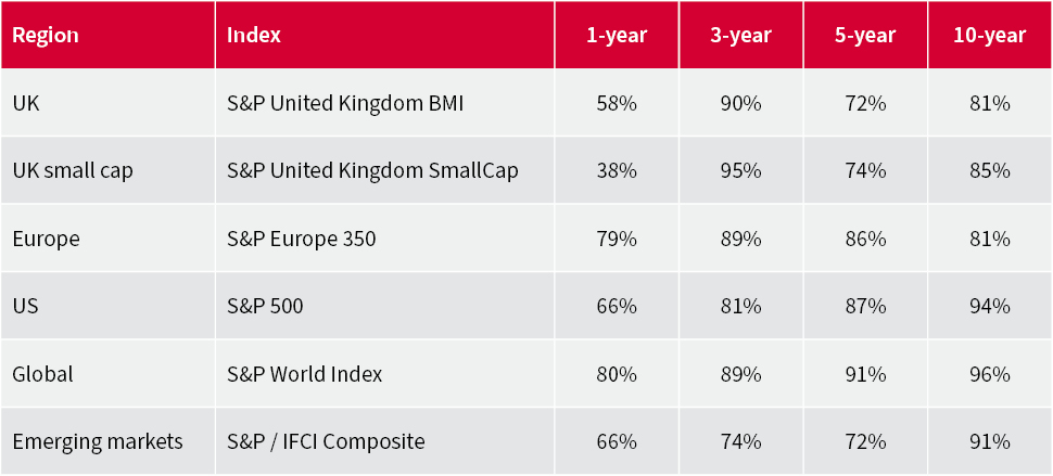 We can measure the benefits of passive, and the performance differences between passive and active funds, by looking at S&P’s Index Versus Active (‘SPIVA’) scorecards. First published in 2002, these are a quantitative review of how active managers in different regions performed against the broader index. The most recent annual scorecard for Europe published last month makes grim reading for active managers. For GBP-denominated funds the percentages underperforming their respective indexes over different time periods are as follows: