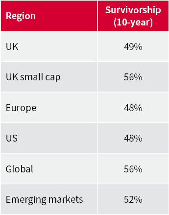 But perhaps an even more pertinent question to ask would not be whether an active fund will outperform over long time periods, but whether it would still be around at all. The SPIVA reports also measure and account for survivorship bias. They found that for the same sections of GBP-denominated funds, only around half last for 10 years or longer.
