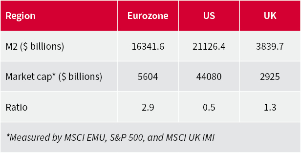 These low valuations, coupled with a low-liquidity environment, could provide a good opportunity for active investors should market sentiment change and passive flows change with it. Currently the Eurozone’s market cap to money supply ratio is around 2.9, compared to the US where it is around 0.5. For context, the UK’s ratio is about 1.3.