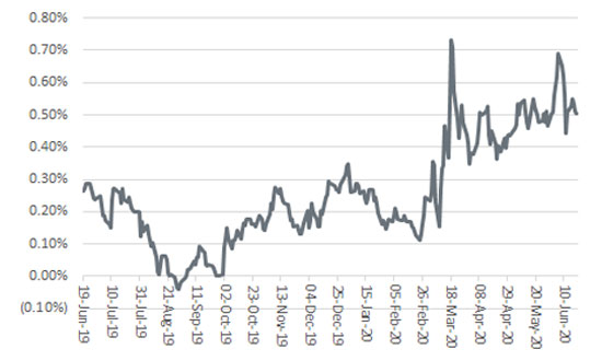 The second is the Russell 2000 small cap index. Small caps tend to be more closely tied in to the economic fortunes of their home market and their share prices tend to be a good guide to the level (or lack) of risk appetite amongst investors. The Russell has outperformed the Dow Jones’s mega caps over one year and its recent loss of momentum could be down to fears of a second wave of COVID-19 in the US as much as it is to the Fed stepping back.