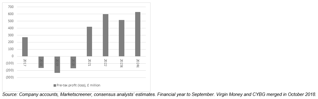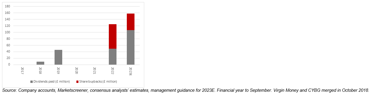 Add together the dividend per share implied by the plan to pay out 30% of 2023’s net profit in dividends and top that up with £50 million in buybacks and Virgin Money UK could return some 7% of its market cap in cash to shareholders in just one year.