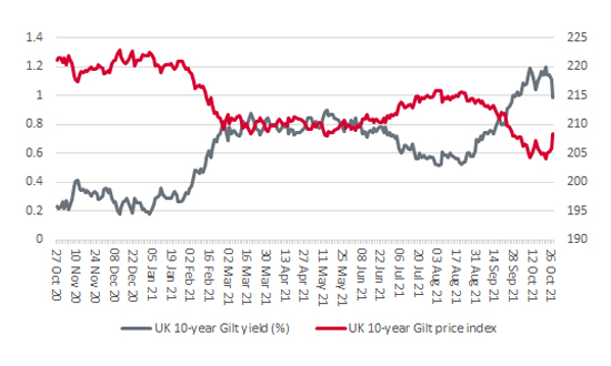 But that was the first bit of good news holders of UK Government debt had had for a while. As inflation has picked up pace, so bond yields have surged and prices tumbled. From its year low of 0.18% on 4 January, the benchmark 10-year Gilt yield rose to a peak of 1.20% on 21 October. That equated to an 8% drop in the price of the paper – so anyone who bought at the yield low (and price peak) lost the equivalent of 44.4 years’ worth of interest.