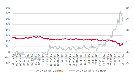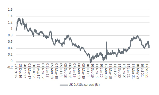 2-year Gilts have lost much less ground than the 10-year paper in 2021