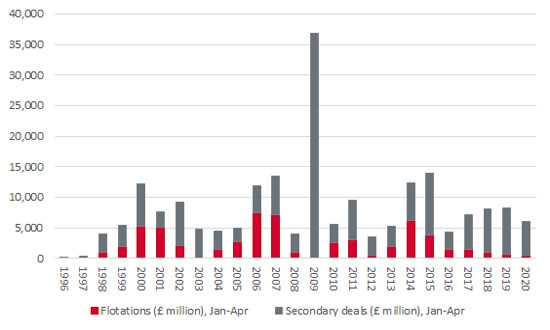 The London market has been relatively quiet so far in 2020. London Stock Exchange data shows that new flotations had raised barely £500 million by the end of April, the slowest start to a year since 2009, while secondary deals by firms that were already listed had generated some £5.6 billion.