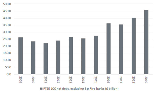 “Outside the Big Five banks, FTSE 100 total net debt (excluding pension deficits and lease liabilities) has soared by three quarters since the Global Financial Crisis ended.”