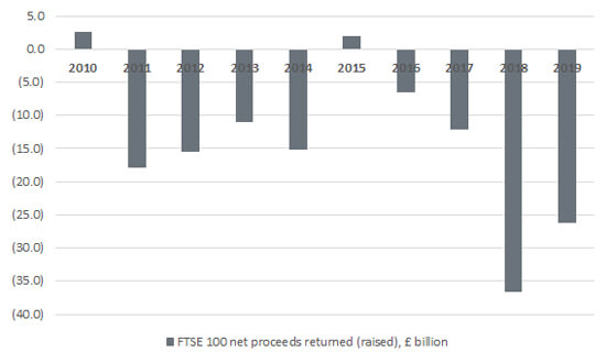 The trend toward de-equitisation, as companies worship at the altar of the cash-light, ‘efficient’ balance sheet and buybacks outpace fund raisings, could therefore come to an end. Data from Bloomberg shows how the current crop of FTSE 100 firms has returned more cash to shareholders via buybacks than it has raised from them on eight occasions in the ten years since the end of the financial crises and cash-raising boom of 2009. Firms may therefore begin to favour cash buffers instead.
