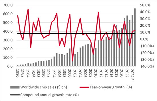 Global silicon chip sales have shown an impressive 8% compound annual growth rate over the past 40-odd years, a figure which easily surpasses trend worldwide GDP growth. However, the industry is notoriously boom-and-bust.