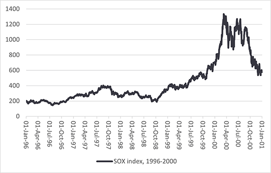 “Note the current market action in the SOX index, in the form of the summer pullback and rebound and compare it to the five-year period of 1996-2000 and how the index saw two or three major but failed rallies before gravity took hold.”