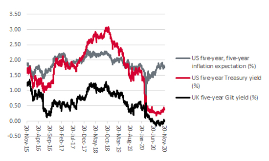 Judging by yields of 0.38% on the US five-year Treasury bond and 0.02% on the UK five-year gilt, bond markets remain of the view that deflation continues to be the danger, or at least that suggests that the next few years are going to be similar to the last 10 or so – namely low growth, low inflation and low interest rates.