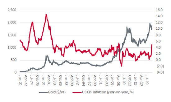 “Gold’s inability to progress to new highs is reminiscent of its struggles to crack $1,300 between 2013 and 2019 and fits with the view of central banks that the current spike in inflation is merely ‘transitory’.”