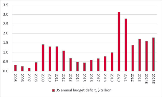 • First, the Biden administration released its planned Budget for 2025. Despite a slew of proposed tax increases to provide additional funding, including a hike in corporation tax to 28% from 21%, the $7.3 trillion spending plan still leaves a $1.8 trillion annual deficit, the third highest ever.
