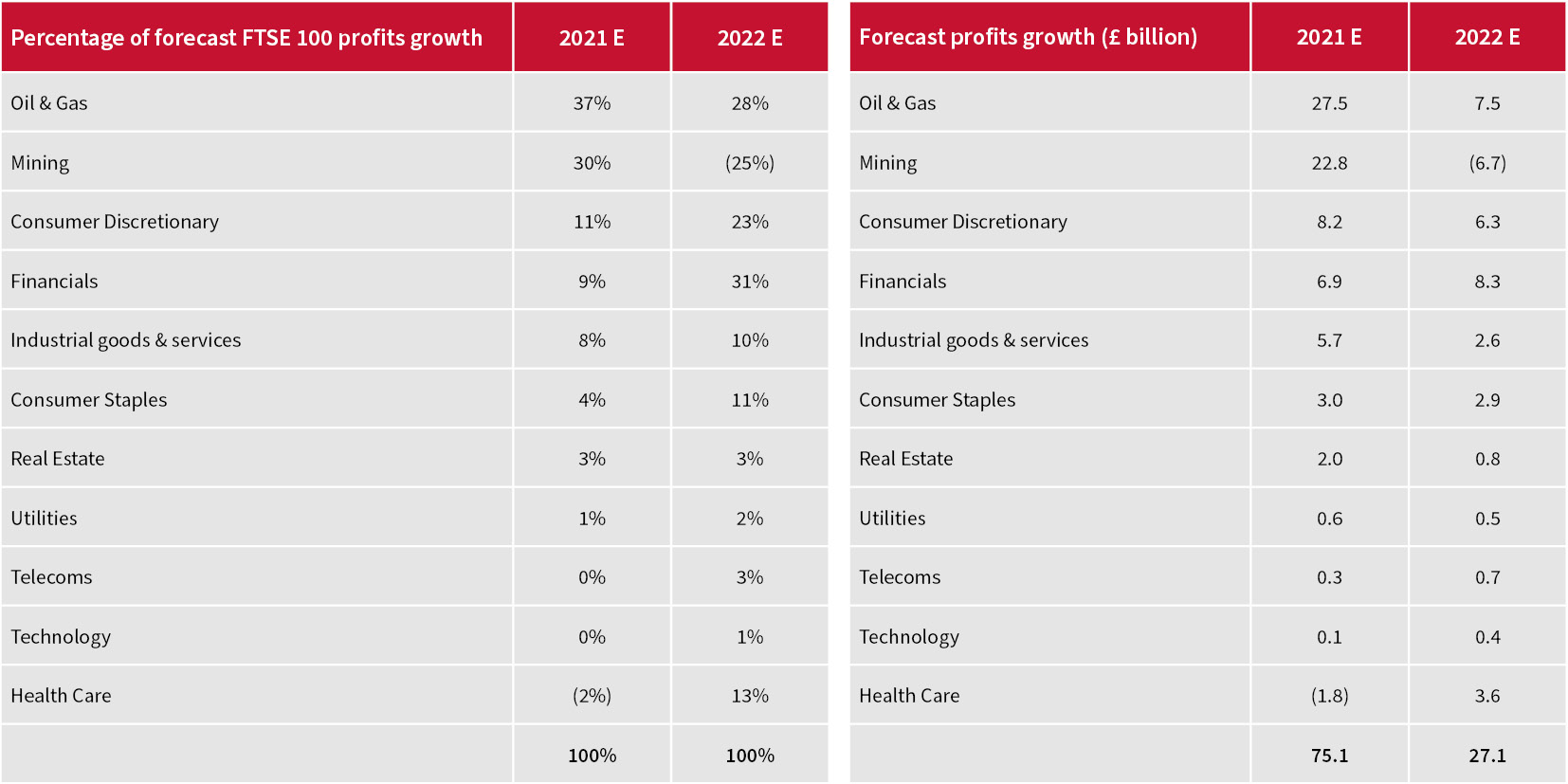 “Miners and oils are expected to generate two thirds of the FTSE 100’s forecast profit increase between them in 2021. Miners, oils and financials are forecast to provide four fifths of the expected profit uplift in 2022.”