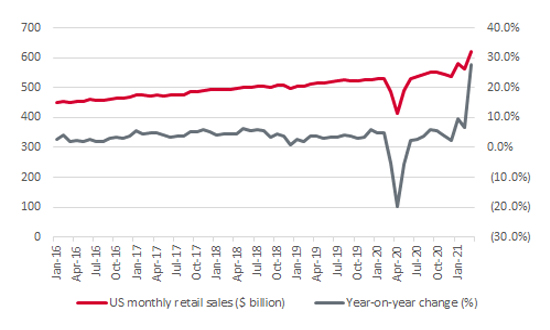 For instance, US retail sales jumped by 28% year-on-year in March, according to data released by the US Census Bureau on 15 April. While allowances can be made for the soft base for comparison offered by the pandemic-hit month of March 2020, the 9.8% month-on-month advance looks to be testament to the power of America’s unlocking, vaccination programmes, ongoing loose monetary policy from the Federal Reserve and fresh fiscal stimulus, in the form of the latest direct payments to consumers – the first direct deposits began to arrive on 17 March.