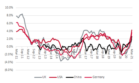 For the same month, the UK showed the fastest increase in producer (or factory gate) prices, just as America and Germany showed the highest rate of increase in nearly a decade. China showed signs of an increase too.