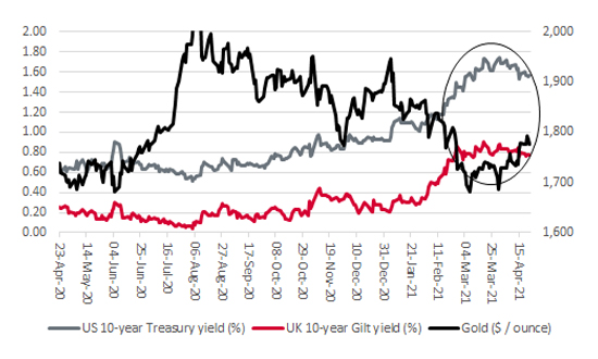 And yet, as this data came through, Government bond yields in the US and UK began to fall, the direct opposite of what investors would normally expect during a robust upturn. After all, who would buy Government papers that offered a yield of say 1.75% a year for 10 years in the US or 0.88% a year in the UK over the same time frame if inflation was about to gallop higher? (Those are the levels at which yields peaked on 31 March.) That would surely be locking in a real-terms (post-inflation) loss.