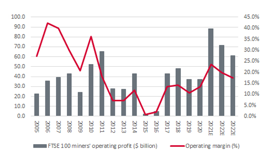 Yet analysts seem to think that the mining sector’s operating margin will peak this year at just 23%, despite years of cost control and the current boom in prices. Granted, that equates to $88 billion of operating profit, a new all-time high, but analysts expect that to ebb to $71 billion in 2022 and $61 billion in 2023, in the view that the initial post-pandemic surge of activity runs out of steam.