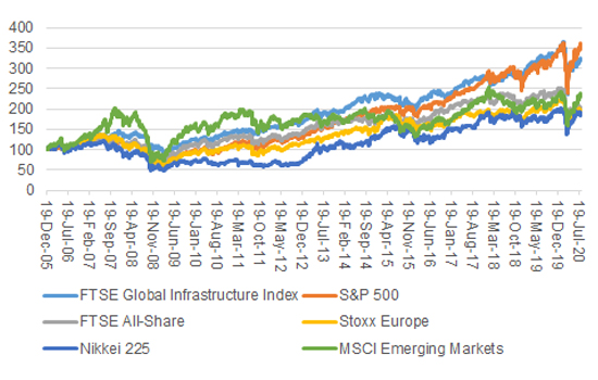 This is surprising in some ways, since infrastructure as an asset class has performed well for a decade or more. Looking at it from the perspective of only listed firms in this field, infrastructure stocks have outperformed all of the major geographic indices bar the super, soar-away USA, which continues to benefit from the barnstorming run generated by Facebook, Alphabet, Amazon, Apple, Netflix and Microsoft.