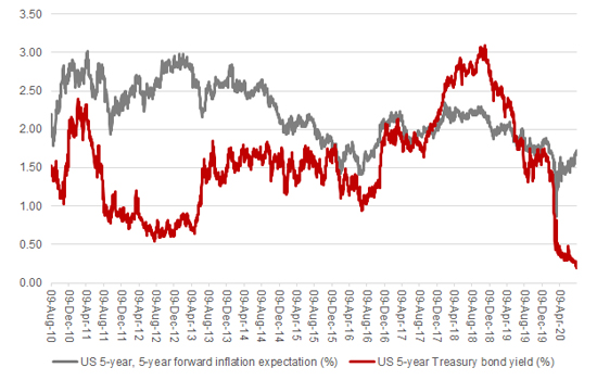 • Fears of inflation. Some advisers and clients may not be convinced by talk of inflation, at a time when the pandemic is still weighing on the jobs market and consumer confidence, demand destruction and a period of weak economic growth remain clear risks. But central bank money-printing schemes, ballooning government deficits, supply-chain disruption (if production is brought back home from China, for example) and firms jacking up prices to cover extra COVID-related costs could yet combine to create a surprise. The US five-year forward inflation expectation indicator is ticking higher, for example, especially if you adjust for the five-year US Treasury yield. This would be a game-changer, as the last 30–40 years have all been about disinflation, and would perhaps make investors appreciate the index-linked nature of many infrastructure firms’ revenue streams.