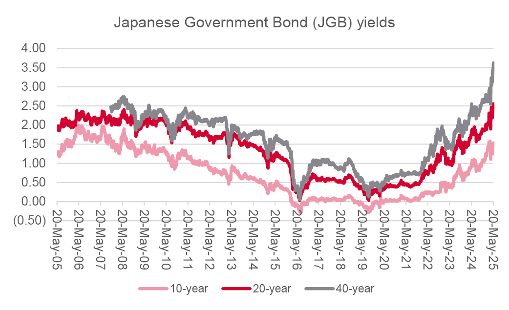 “This is all making the nugatory yields available on JGBs look very poor value indeed and markets are taking evasive action as a result. Yields are rising, especially on longer-dated paper, as can be seen most spectacularly in the case of the 40-year JGB.”