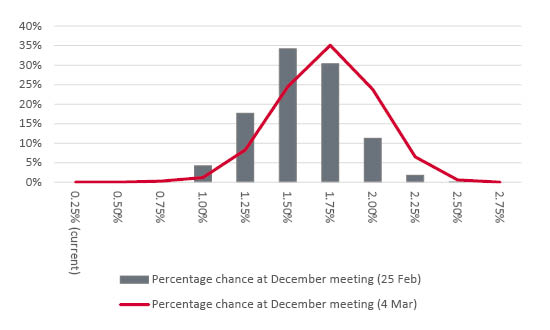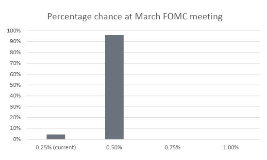 Markets are pricing in a quarter-point hike from the Fed on 16 March