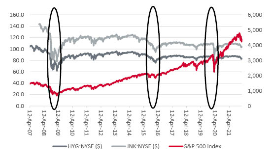 As a result of that, high yield is often seen as a lead indicator for equities. The asset class can be followed quickly and easily by checking out the prices of two US-listed Exchange Traded Funds, the SPDR Bloomberg High Yield ETF (JNK:NYSE) and the iShares iBoxx High Yield Corporate Bond ETF (HYG:NYSE).