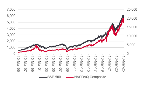 The timing of the latest US equity market stumble, be it no more than that or a warning of something more malign, is notable for how it coincides with the twenty-fifth anniversary of top in the technology, media and telecoms bubble. The NASDAQ Composite peaked at 5,048 on 10 March 2000. It troughed at 1,114 on 9 October 2002 and then took thirteen years to recoup that crushing loss.