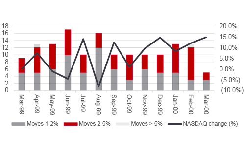 One sign that trouble may have been coming in 2000 was how volatility started to increase. As valuations became extended, even when based on very bullish earnings growth forecasts, any minor departure from the bullish script caused share prices to slide, only for the bullish narrative to reassert itself. Again, this can be seen in how the number of one-day, open-to-close movements in excess of 1%, 2% and 5% became increasingly prevalent, even as the NASDAQ doubled in a year.