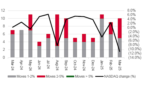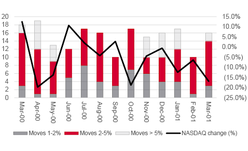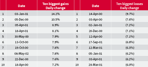 Worse was to follow. Volatility soared – the NASDAQ by more than 1% on an open-to-close basis on 196 occasions in the next 260 trading days, with 115 gains or drops between 2% and 5% and 31 swings of more than 5%.