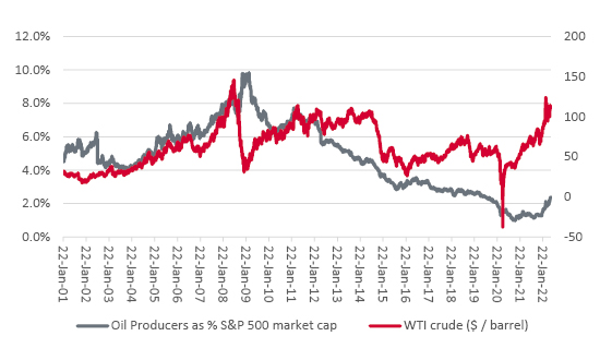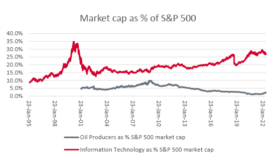 “In the USA, the major oil producers command an aggregate market capitalisation which represents just 2.4% of the S&P 500 index’s total $33 trillion price tag. Granted, that is a big leap from the lows of autumn 2021 but it is barely a quarter of the highs seen in the middle of this millennium’s first decade.”