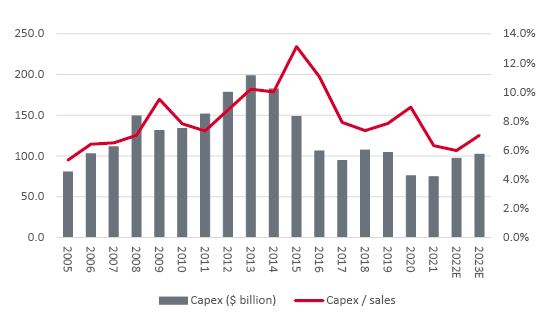 In the USA, the major oil producers command an aggregate market capitalisation which represents just 2.4% of the S&P 500 index’s total $33 trillion price tag. Granted, that is a big leap from the lows of autumn 2021 but it is barely a quarter of the highs seen in the middle of this millennium’s first decade.