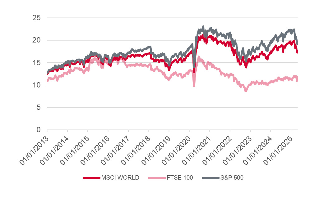 In 2016, the gap between all three indices started to widen and that’s continued since. At the start of 2025, the S&P 500 traded on 22.3 times 12-month forward earnings estimate, compared to 19.5-times for the MSCI World and 11.2-times for the FTSE 100. Investors were happy to pay twice as much for a US share as an UK one.