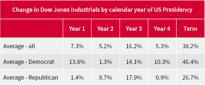 However, politics alone is unlikely to shape the fortunes of the Dow Jones and America’s other leading equity indices, as the backdrop to the best (and worst) returns from the third year of a Presidency suggests.