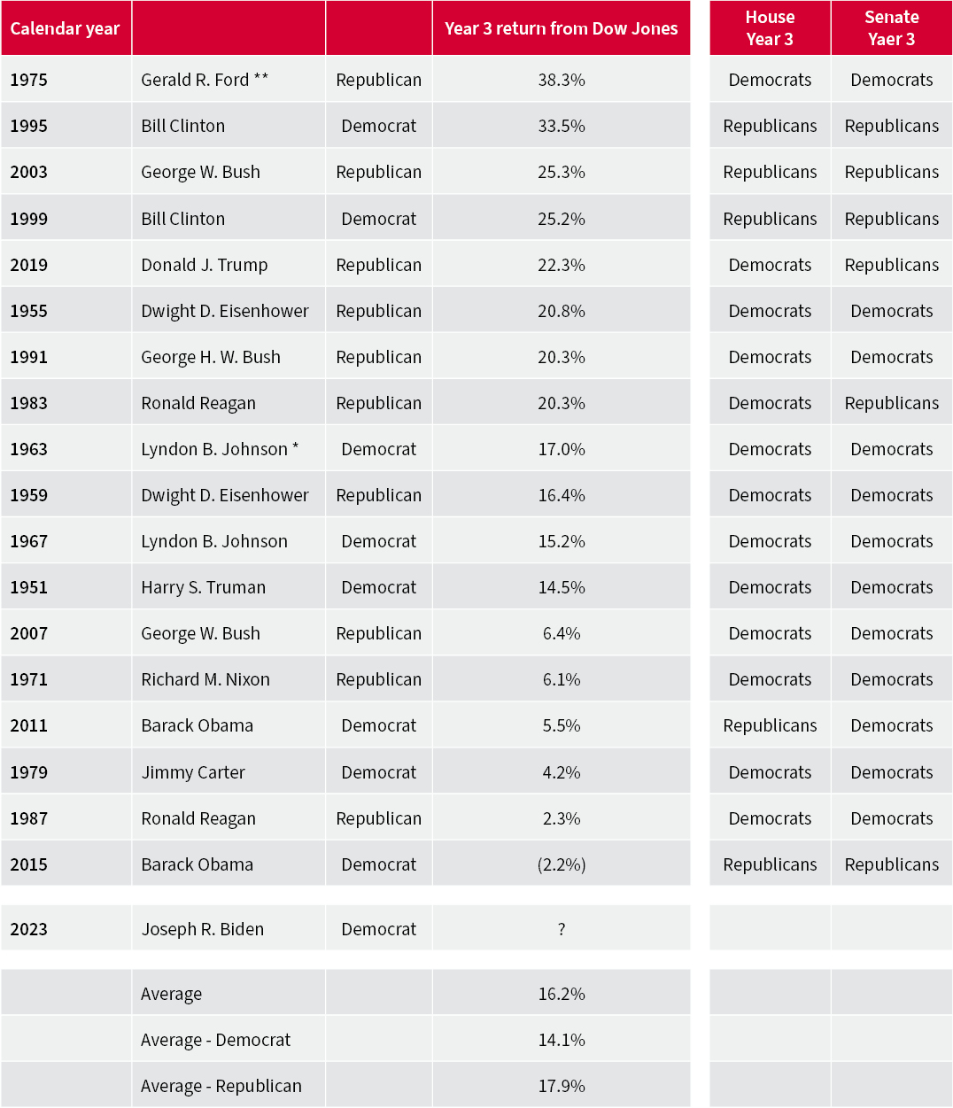 This compares to the average single-digit percentage gains generated during the first, second and fourth and final years of a Presidency.