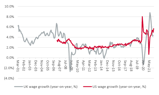 Source: Office for National Statistics, US Bureau for Labor Statistics, FRED – St. Louis Federal Reserve database