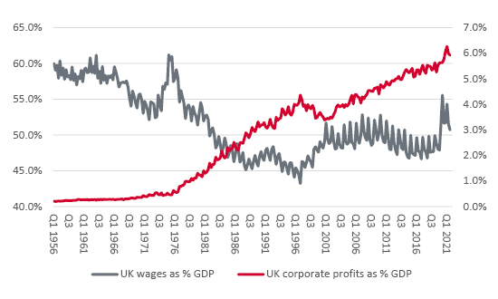 A similar trend can be seen in the UK, where the data goes back to 1955. Since then, labour’s take-home slice of the economy has dropped by almost ten percentage points, while corporations have increased theirs by the thick end of six points.
