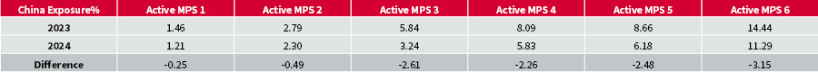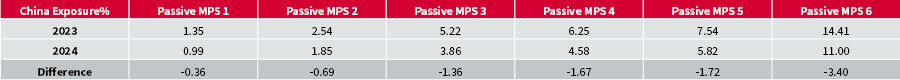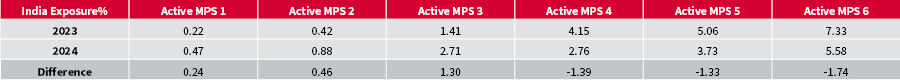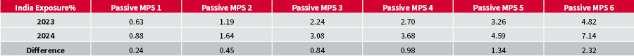 This reduction in Chinese exposure is evident across all Passive MPS categories, ranging from -0.36% to -3.40%. On the other hand, exposure to India has increased in the portfolios to balance this out.